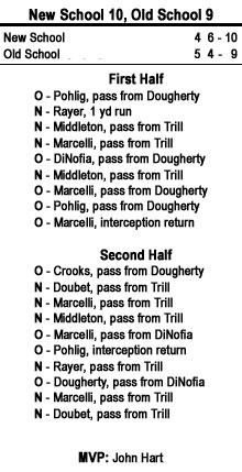 Old School opened the game with a sack of New School quarterback Mike Trill. Then, after forcing a punt, Old School proceeded to score on their second play from scrimmage when Tim Dougherty hit Bill Pohlig on a deep fly pattern. After tying the game at one on a rushing touchdown by Kevin Rayer, New School eventually took a 4-2 lead after touchdowns by Paul Middleton and Mark Marcelli. Old School battled back to a 4-4 tie before Matt Marcelli sent the Old Schoolers into halftime with a 5-4 lead when he returned an interception for a touchdown.