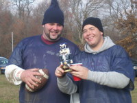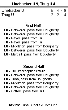 In a game that at times resembled a defensive struggle, credit needs to be given to Linebacker U DB Mark Marcelli and Thug U Lineman Tony Laughlin. Mark came to play, laying big hits all over the field, mostly felt by Thug U Receivers Matt Marcelli and Chris Crooks. Mark’s father, Peter Marcelli, made this comment on the sidelines, "When Mark was younger playing for Swarthmore, the kids on his team would ask Mark to stop ‘low bridging’ them because he hit so hard." Mark consistently made great open field tackles on the Thug U receivers. I can attest to this first hand, as I am writing this still feeling the effects of Mark’s strong hits throughout my body, mostly in my black eye and my broken thumb. Other sideline interviews produced similar comments and observations, but Eric Hazlett summed it up best when he said, speaking to Thug U receiver Matt Marcelli, "You guys sucked today."